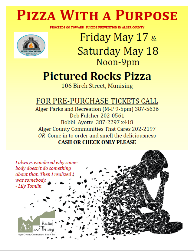 You can help support Suicide Prevention in Alger County — and all you need to do is order a pizza or two! Order a pizza from Pictured Rocks Pizza from 12pm – 9pm on Friday and Saturday, May 17 & 18, 2019. The proceeds from your order will go toward the cause!